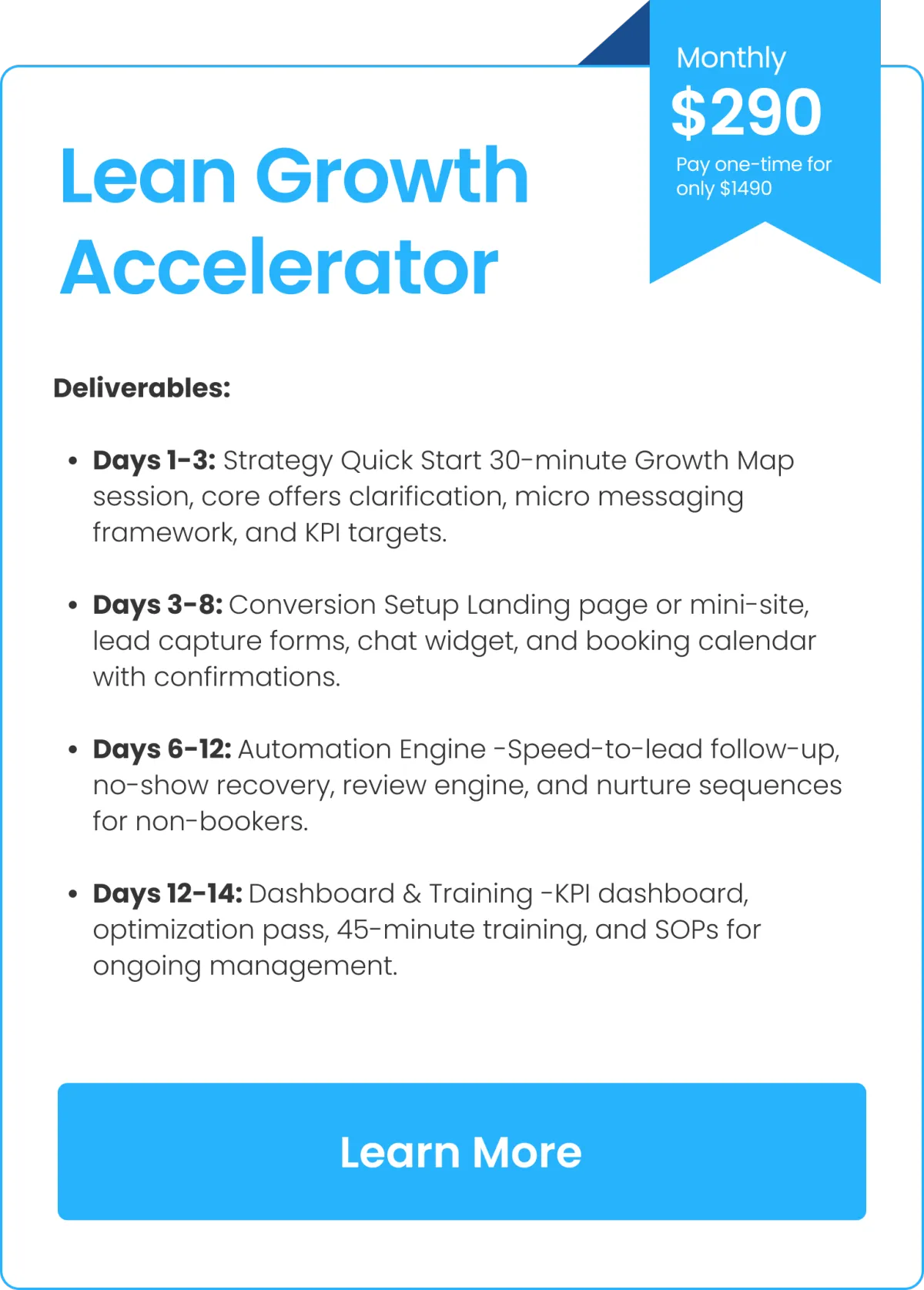 ✓ Simple dashboard tracking: leads, bookings, show rate, reviews, response time