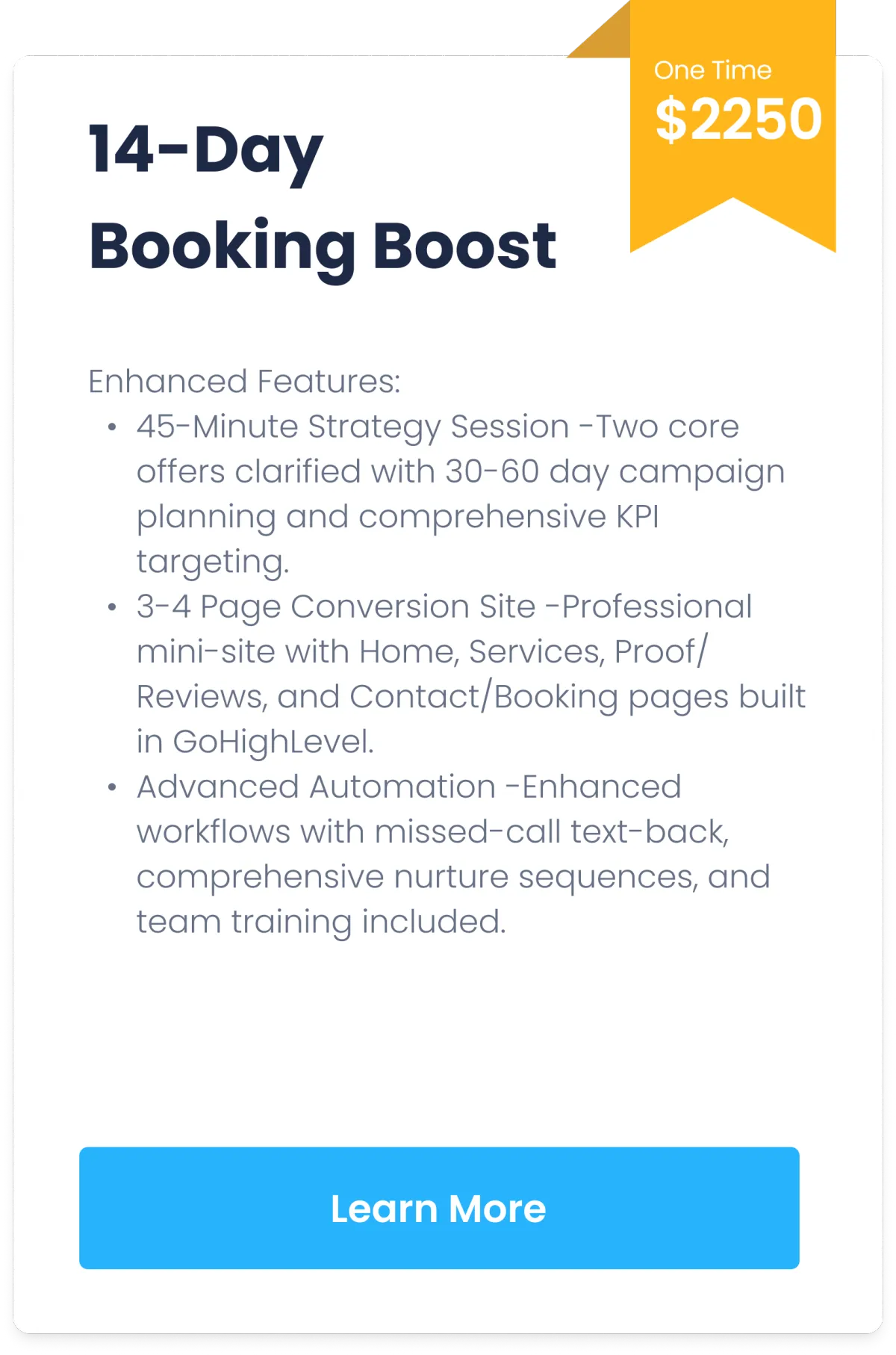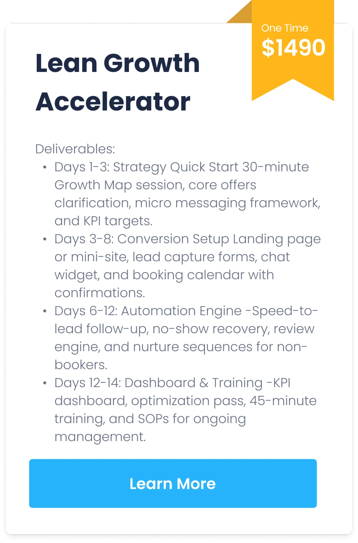 In just 14 days, we install a minimum-viable growth system that automates lead follow-up within 5 minutes and generates fresh customer reviews. See immediate momentum without hiring extra staff or wasting time on manual outreach. This is pure, trackable conversion power.