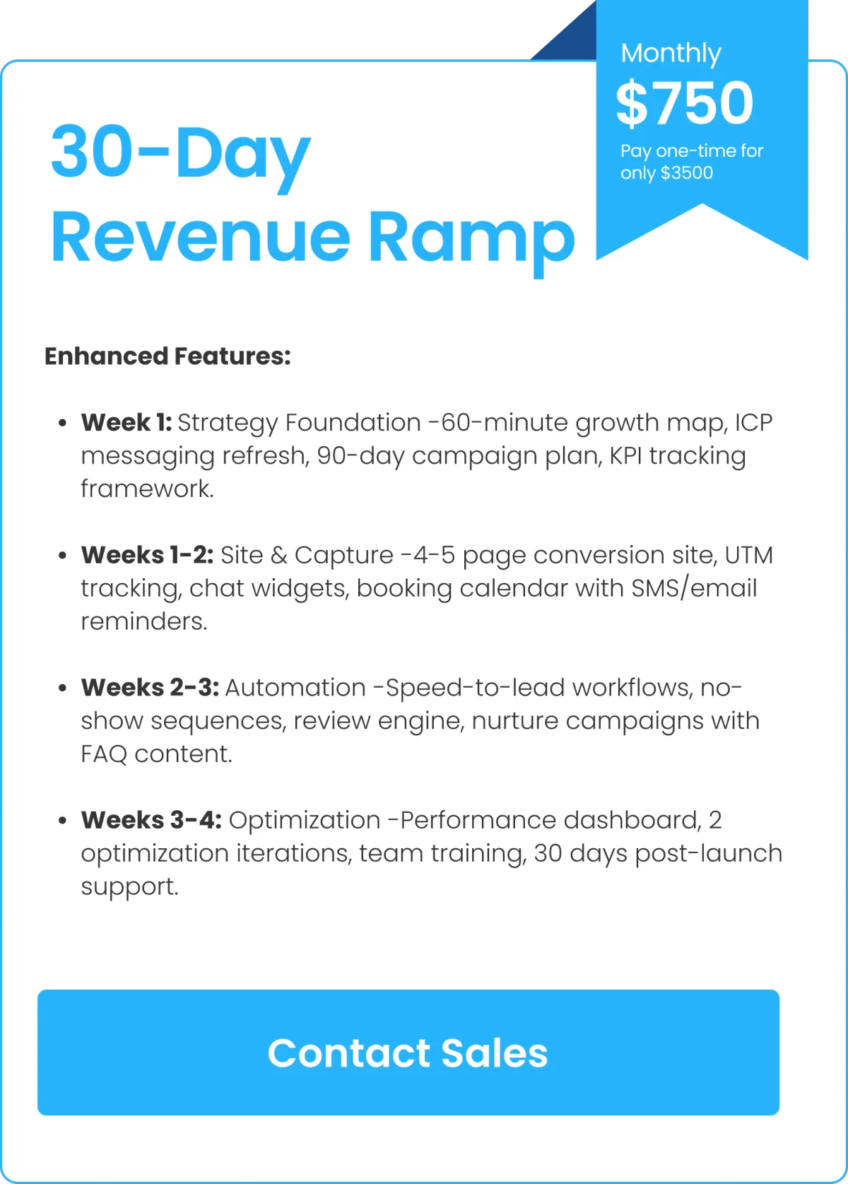 Days 1-3: Strategy Quick Start 30-minute Growth Map session, core offers clarification, micro messaging framework, and KPI targets.