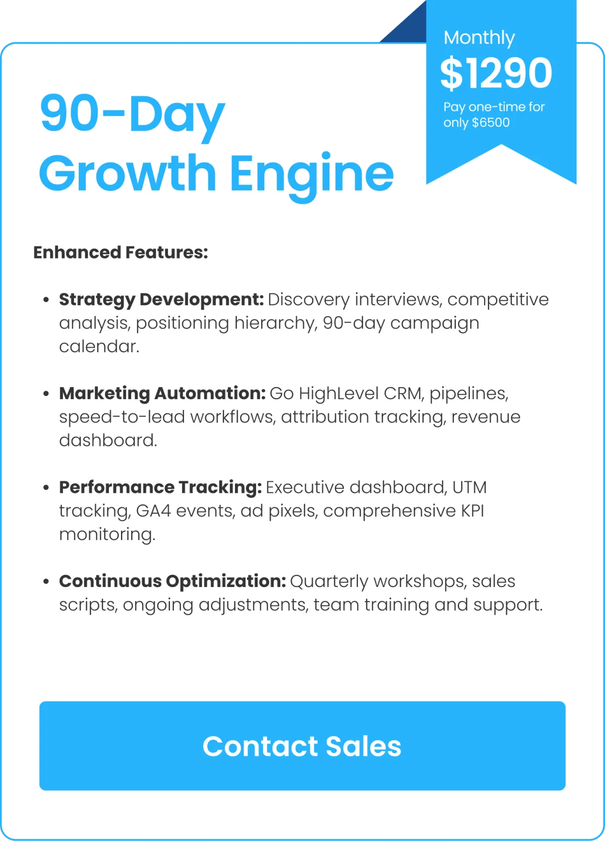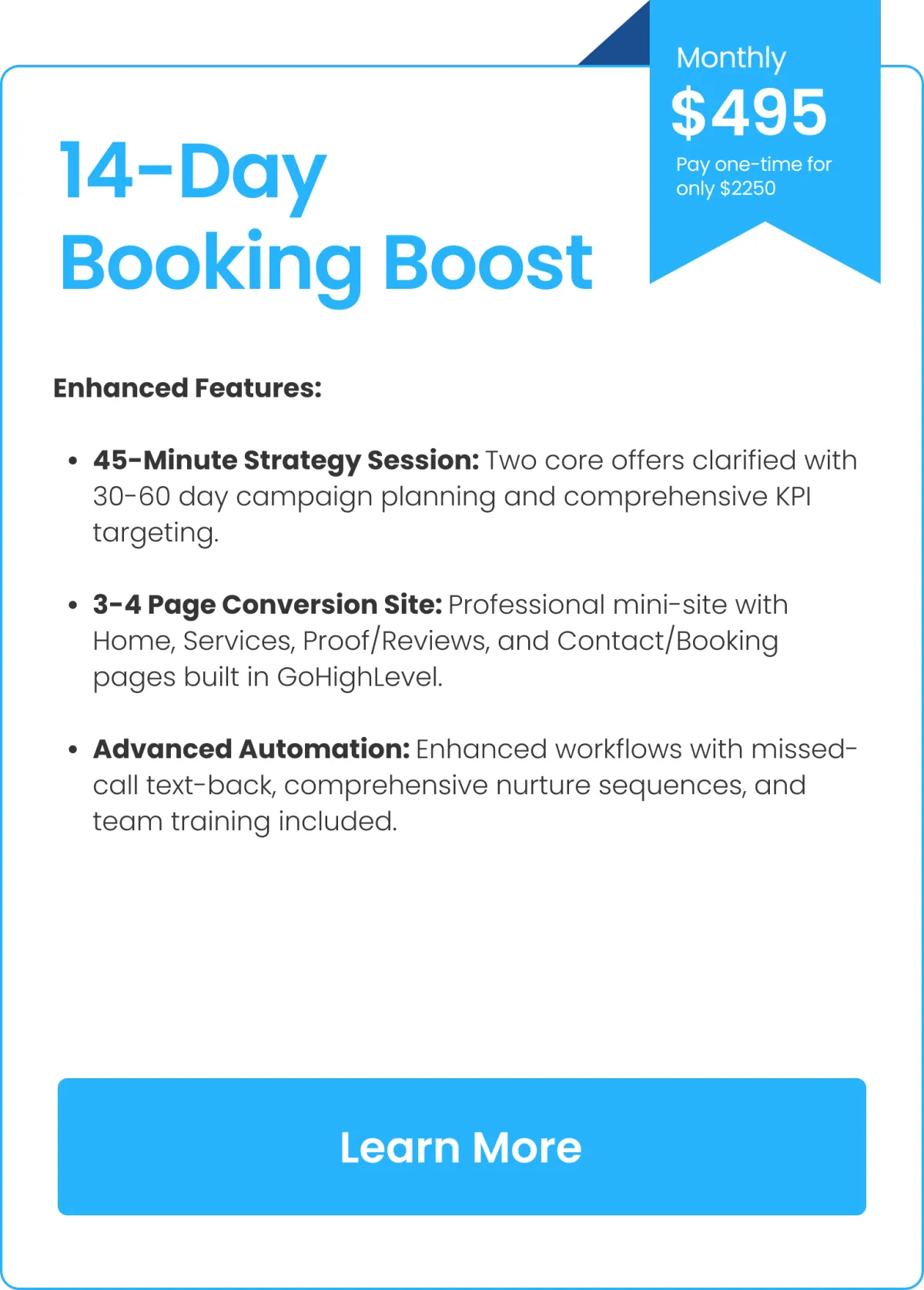 In just 14 days, we install a minimum-viable growth system that automates lead follow-up within 5 minutes and generates fresh customer reviews. See immediate momentum without hiring extra staff or wasting time on manual outreach. This is pure, trackable conversion power.